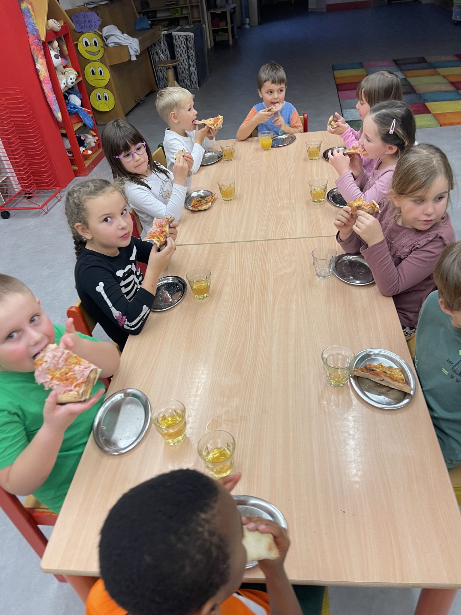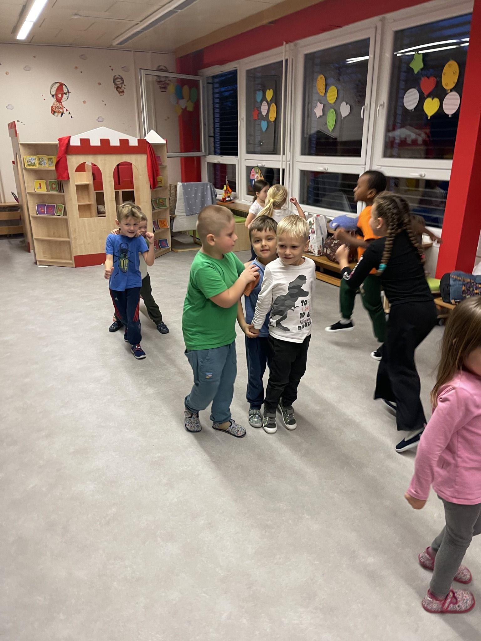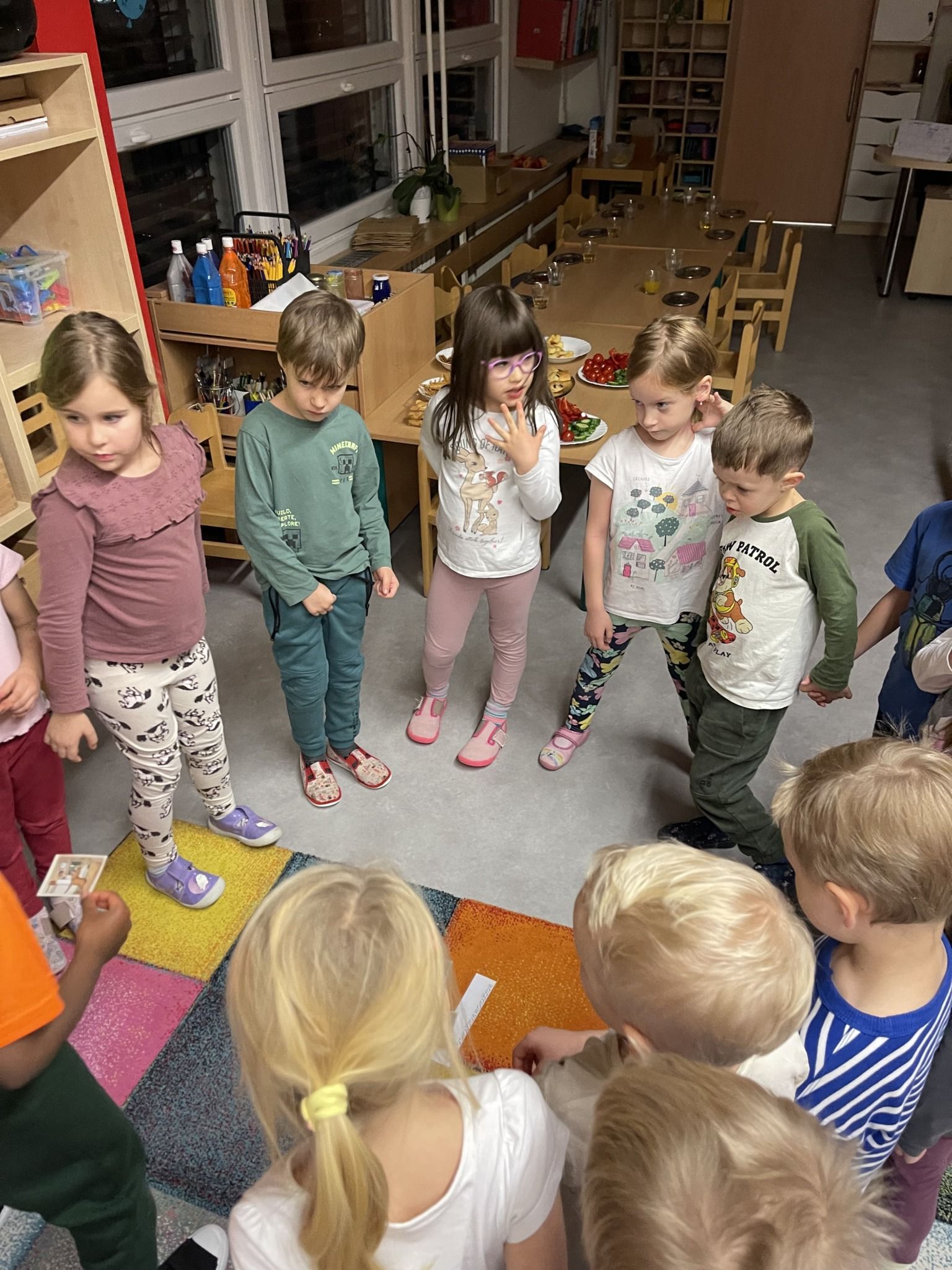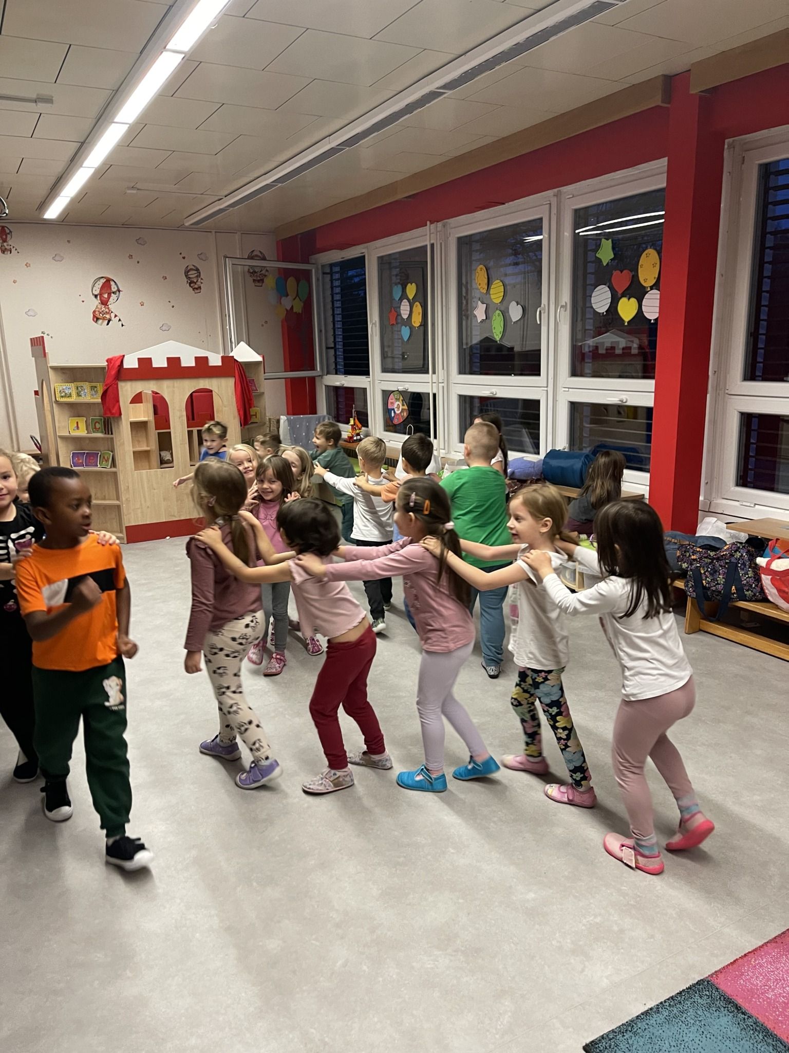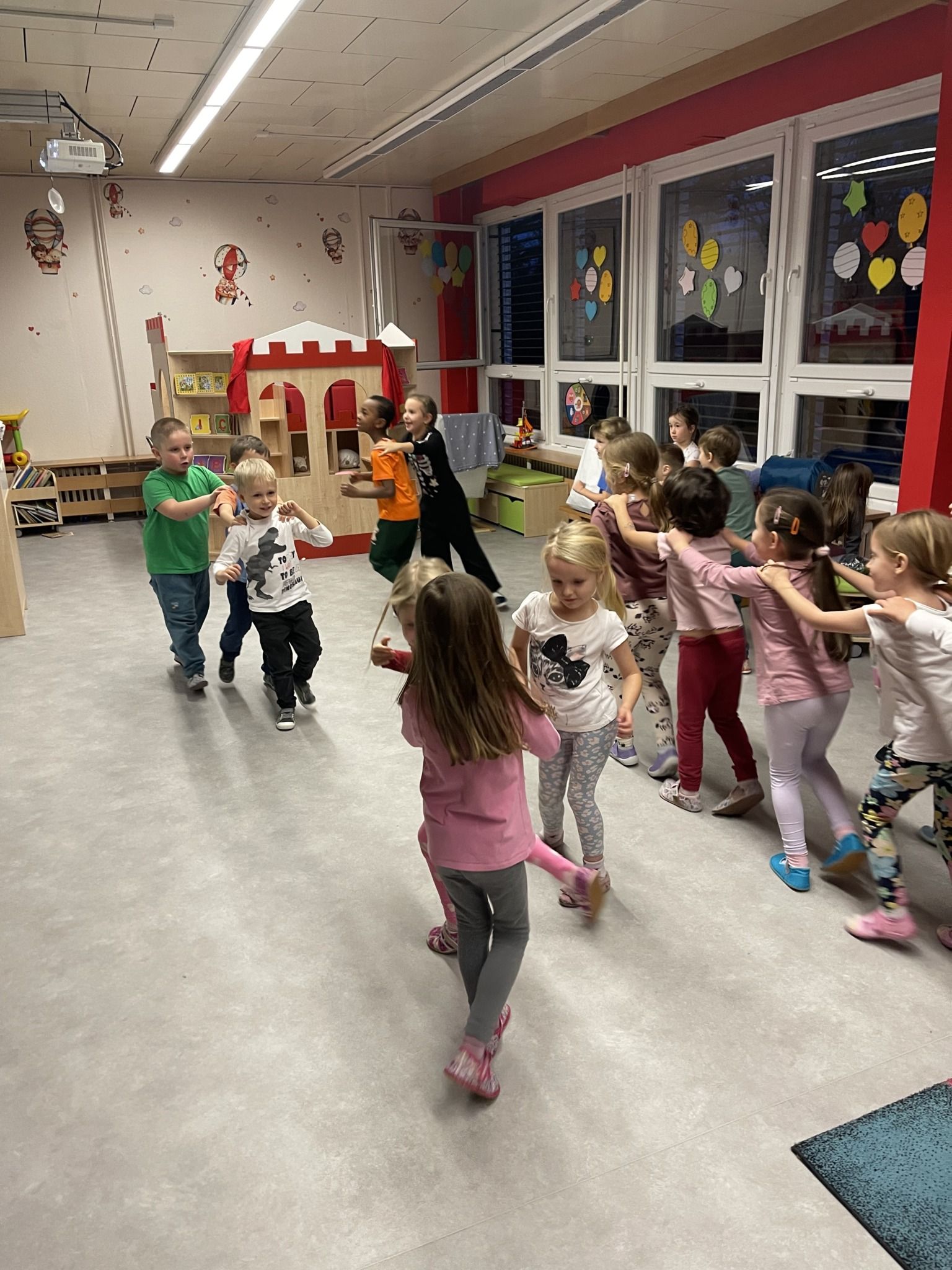 Celý večer byl proložen zábavou spojenou s pohádkami a ukončenou čtením “Zelené Karkulky před spaním. Hrály se různé hry – skládání děje pohádek podle obrázků, hádání pohádkové postavy podle popisu, skládání obrázků pohádkových postav a také písničkami z pohádek. Cesta pro poklad byla pro odvážné, ale zvládly to všechny děti. Děti také ohromila osvětlená Praha a samozřejmě večerní pizza. Noc byla klidná.